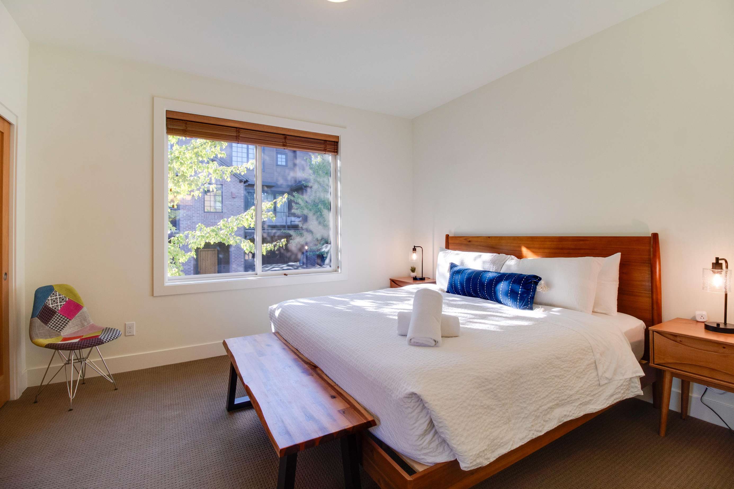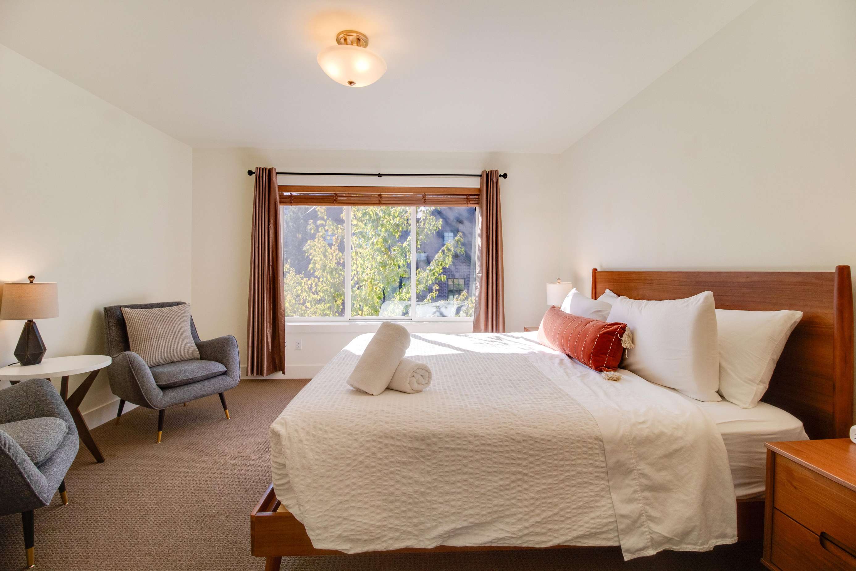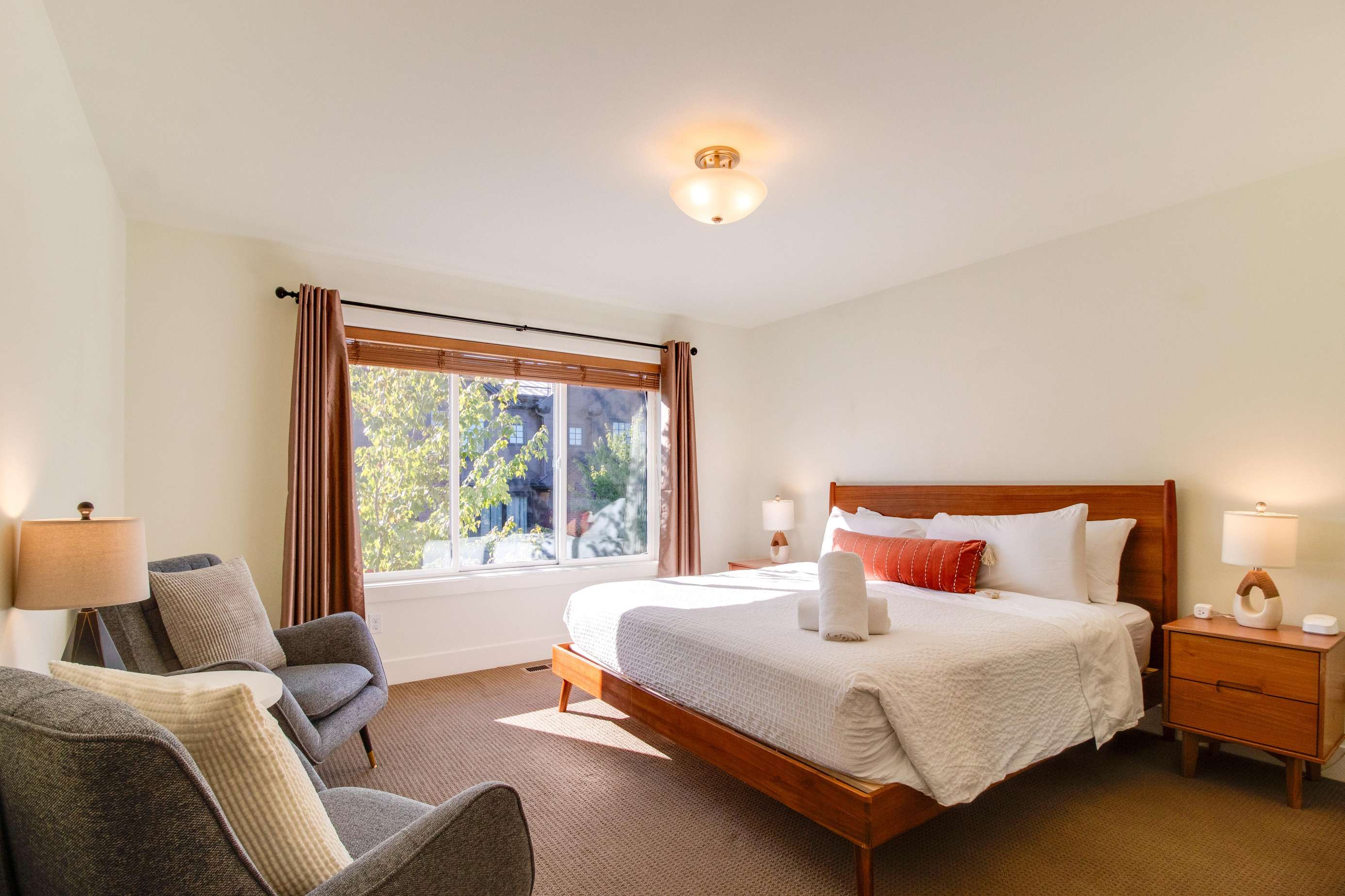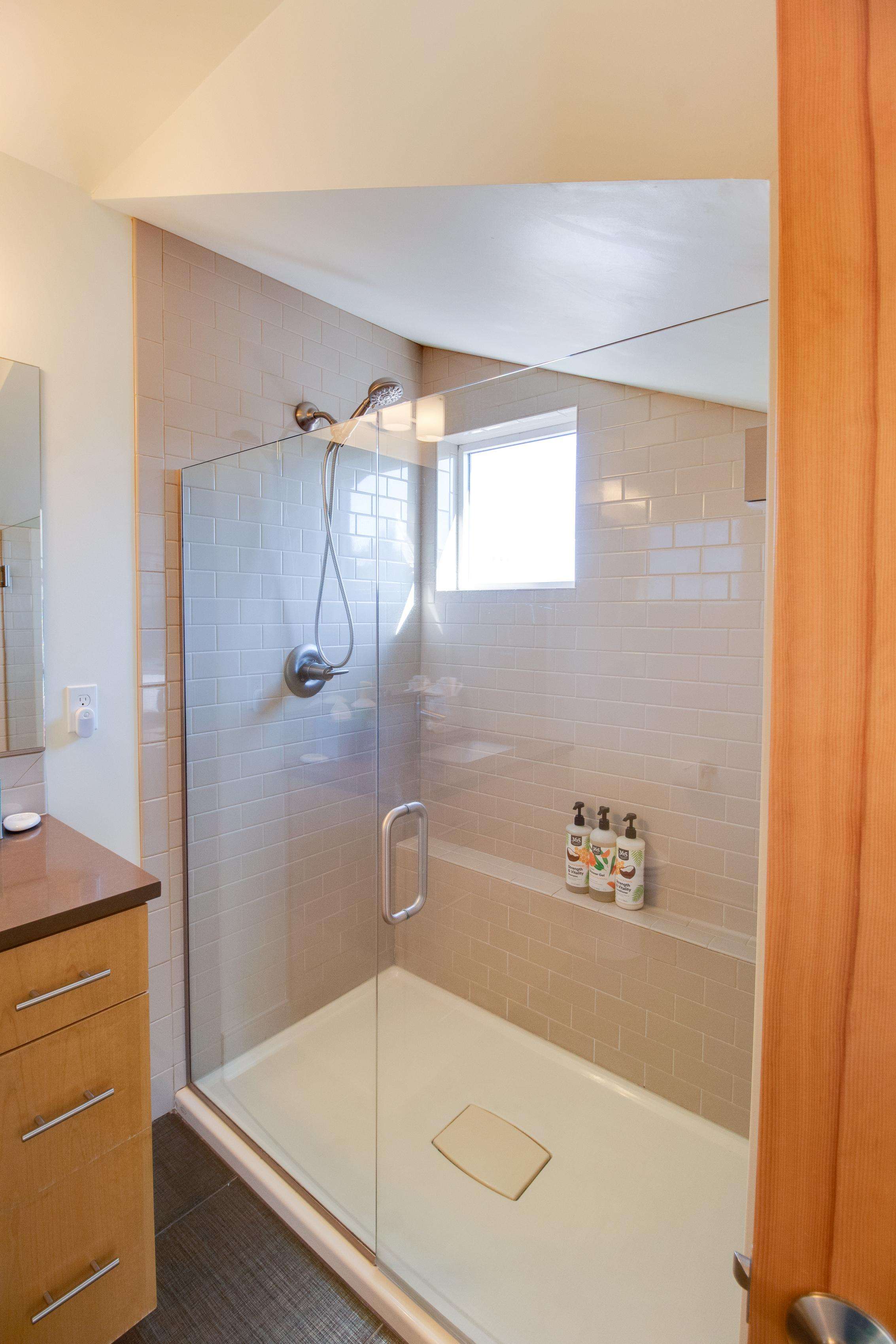 The 2nd king bedroom is on the 3rd floor with views of the neighborhood. It is also spacious and welcoming. Enjoy a little quiet time in your own sitting area. We still have some items on order for this space and will post pictures as soon as our lamp and table(s) arrive. Everyone in this home has their own dedicated bathroom, what a treat! This bedroom's ensuite bathroom has a large walk-in shower (no tub) with a view of the Old Mill smokestacks.