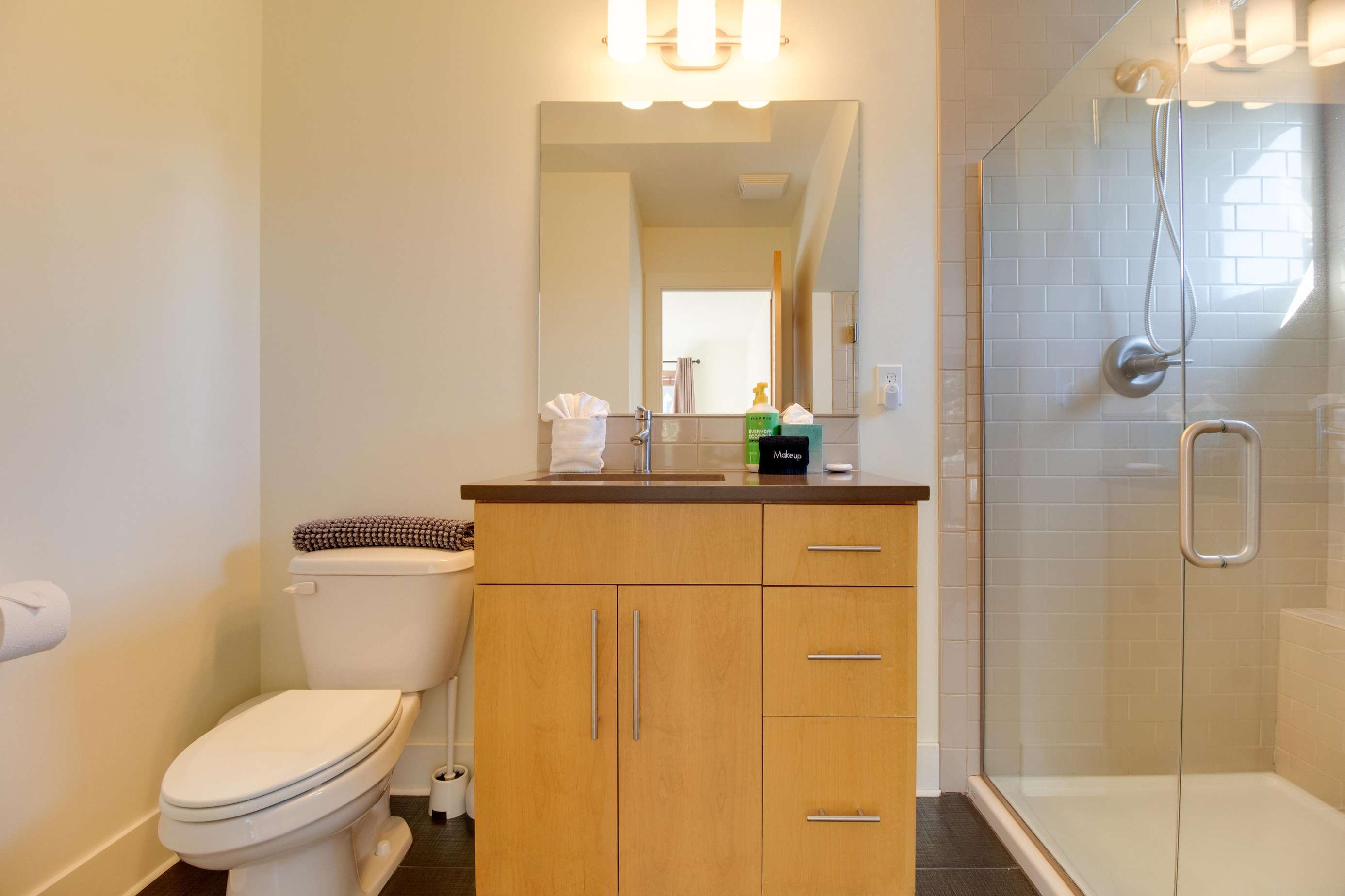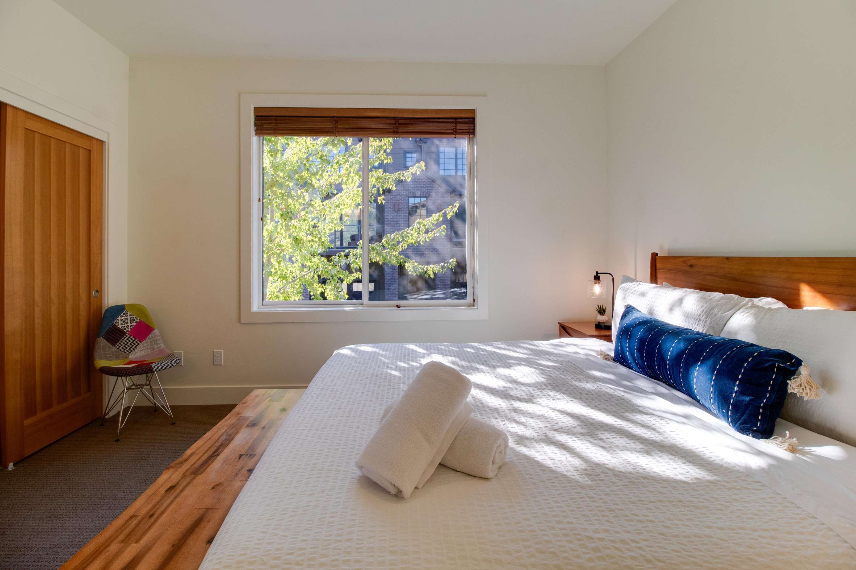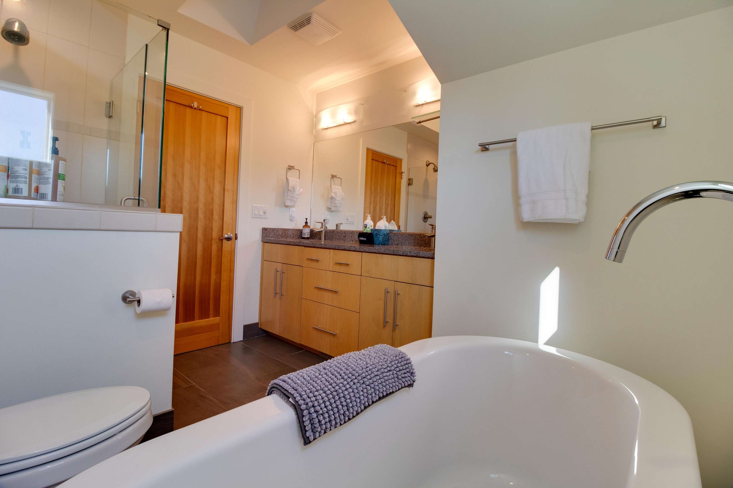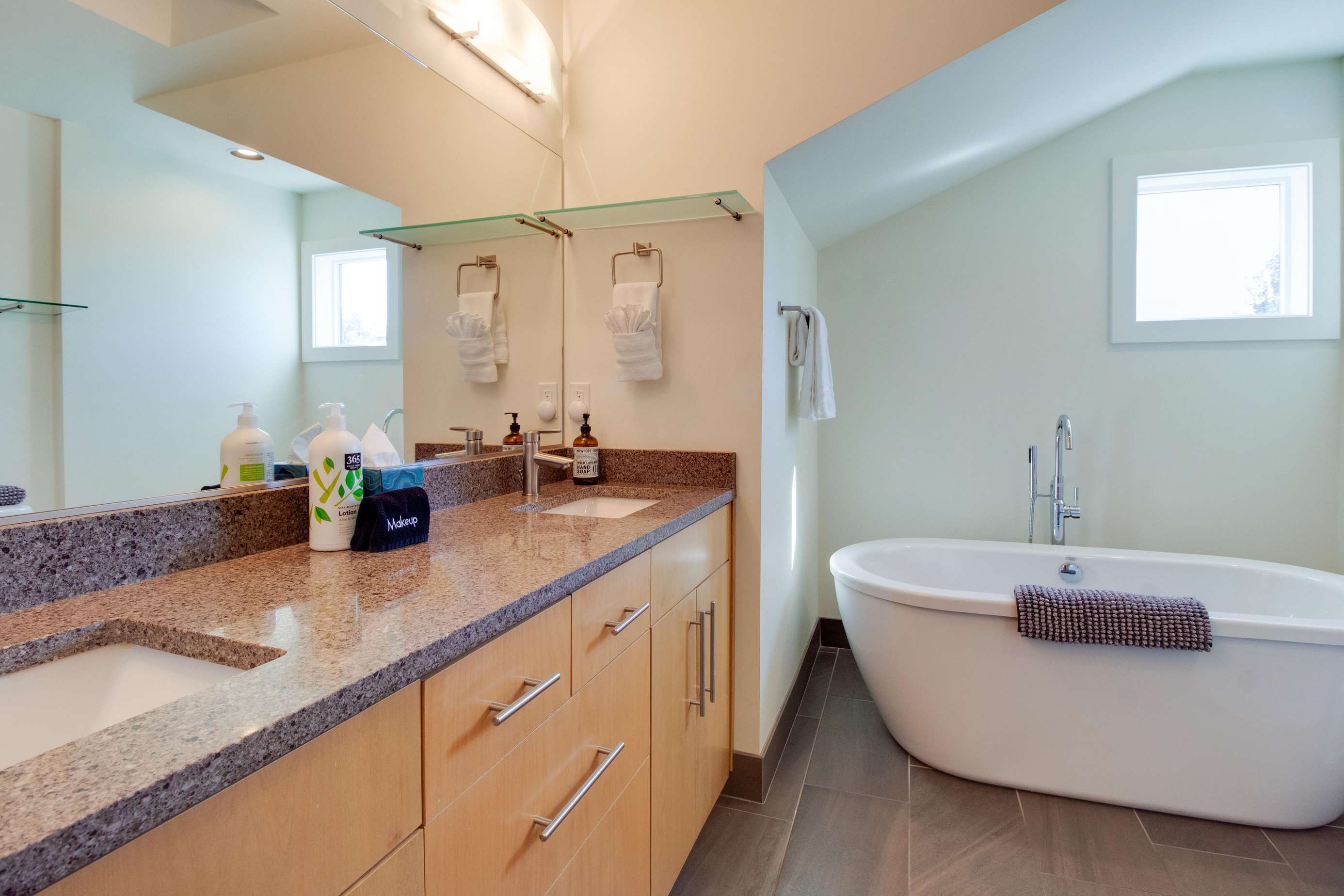 The 2nd king bedroom is on the 3rd floor with views of the neighborhood. It is also spacious and welcoming. Enjoy a little quiet time in your own sitting area. We still have some items on order for this space and will post pictures as soon as our lamp and table(s) arrive. Everyone in this home has their own dedicated bathroom, what a treat! This bedroom's ensuite bathroom has a large walk-in shower (no tub) with a view of the Old Mill smokestacks.