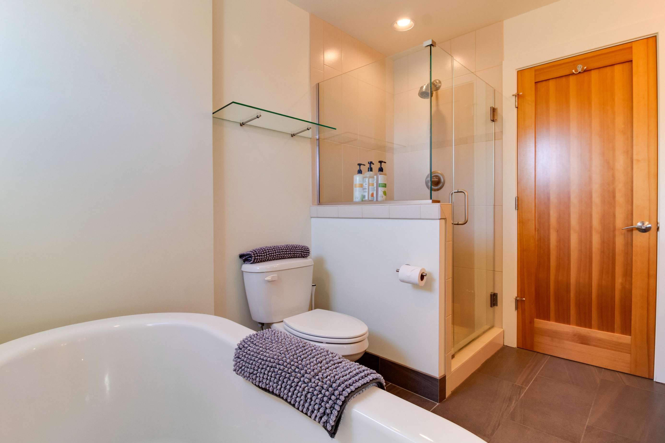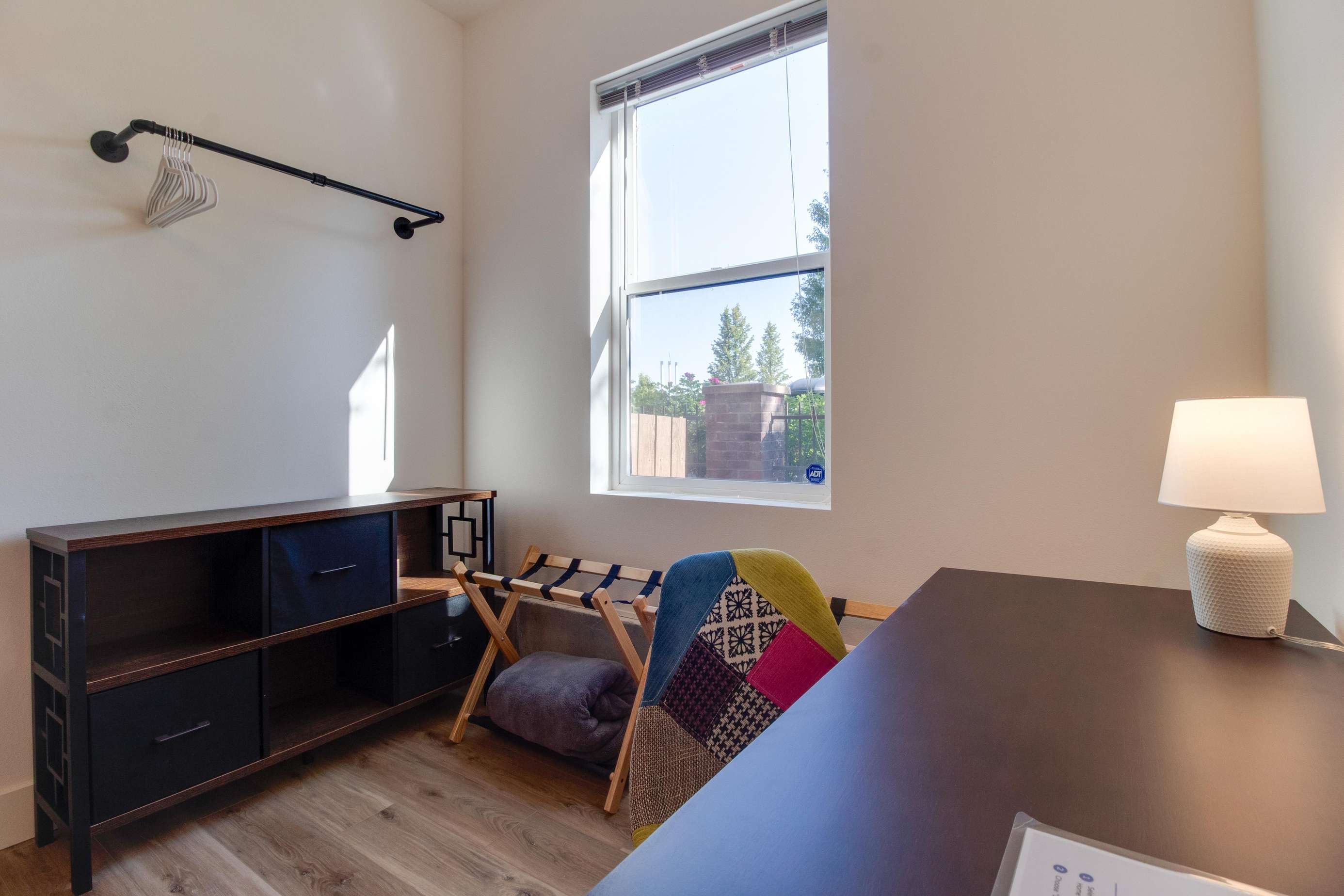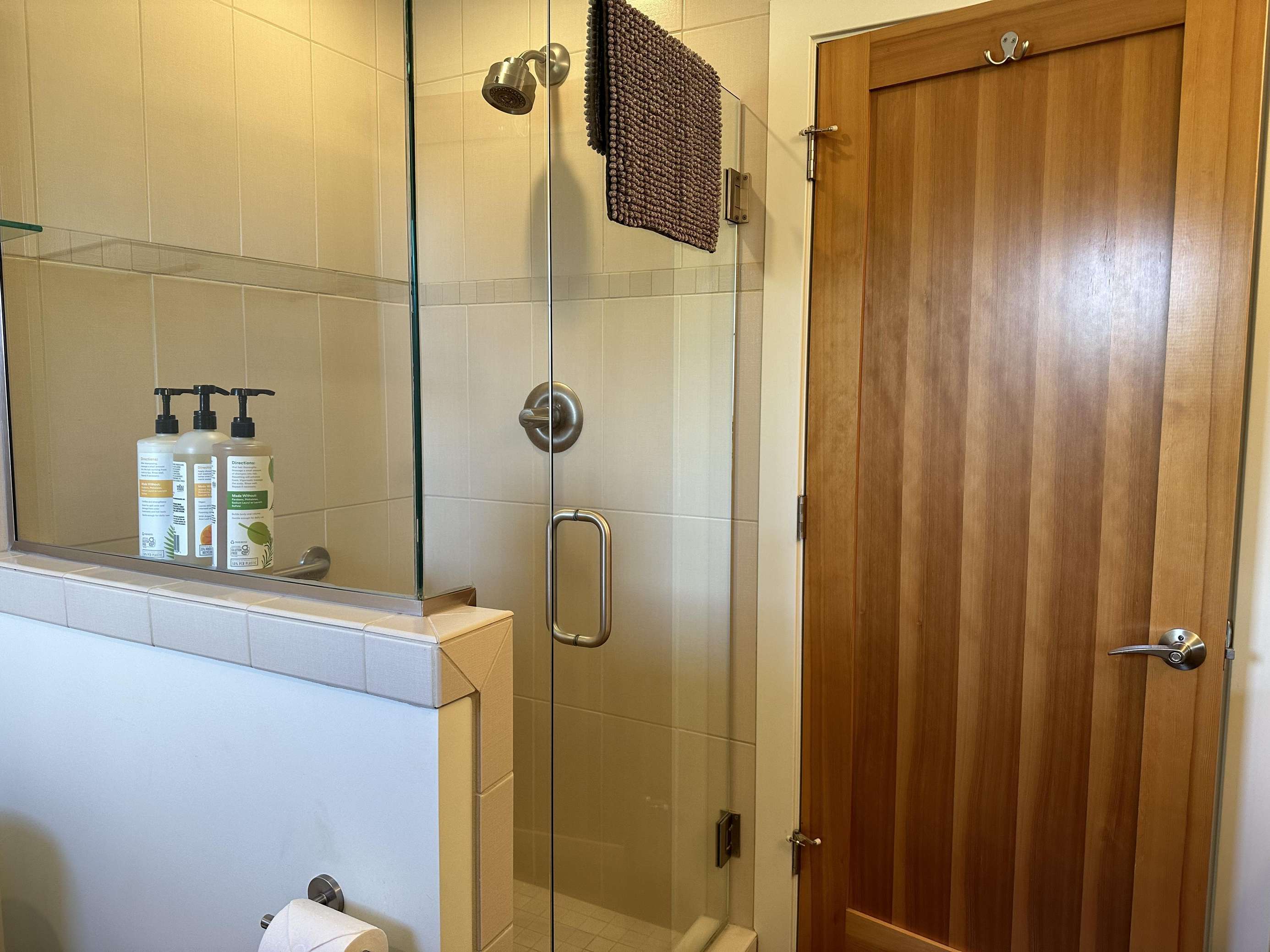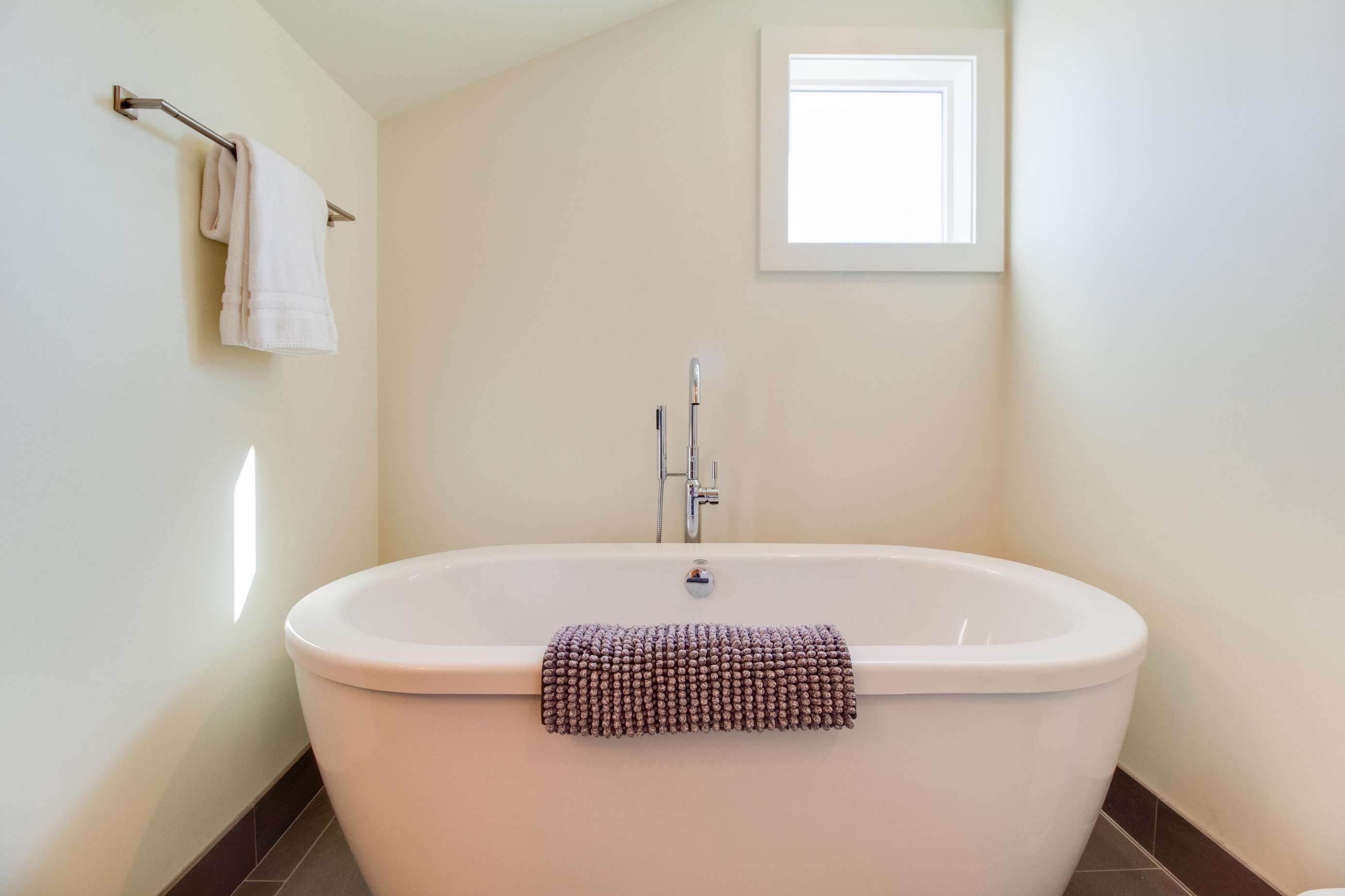 The 2nd king bedroom is on the 3rd floor with views of the neighborhood. It is also spacious and welcoming. Enjoy a little quiet time in your own sitting area. We still have some items on order for this space and will post pictures as soon as our lamp and table(s) arrive. Everyone in this home has their own dedicated bathroom, what a treat! This bedroom's ensuite bathroom has a large walk-in shower (no tub) with a view of the Old Mill smokestacks.