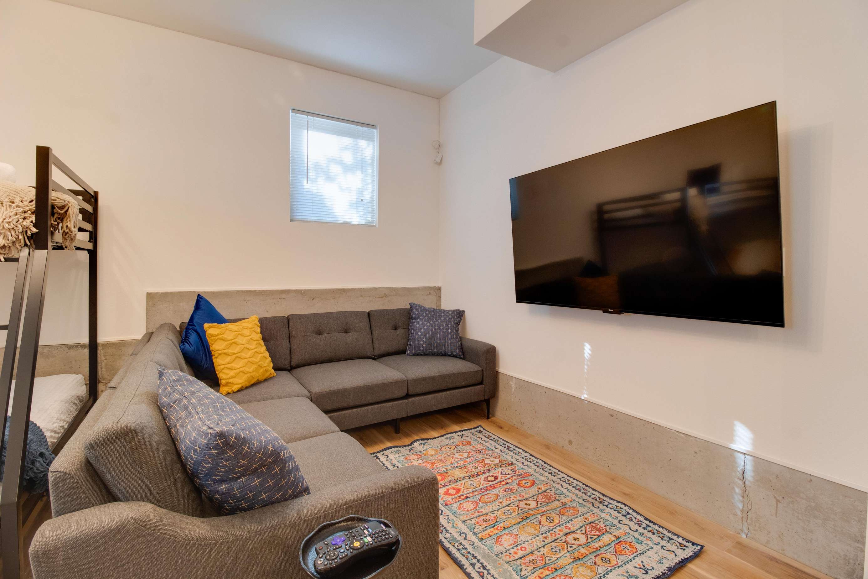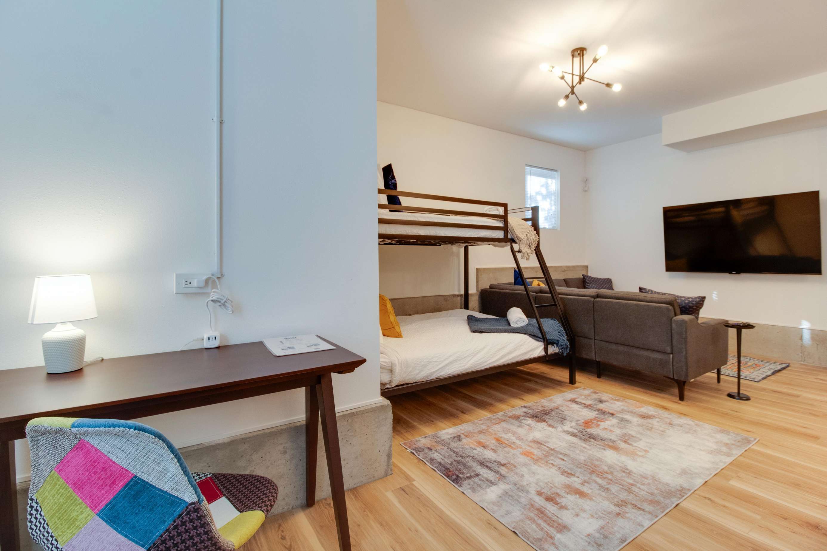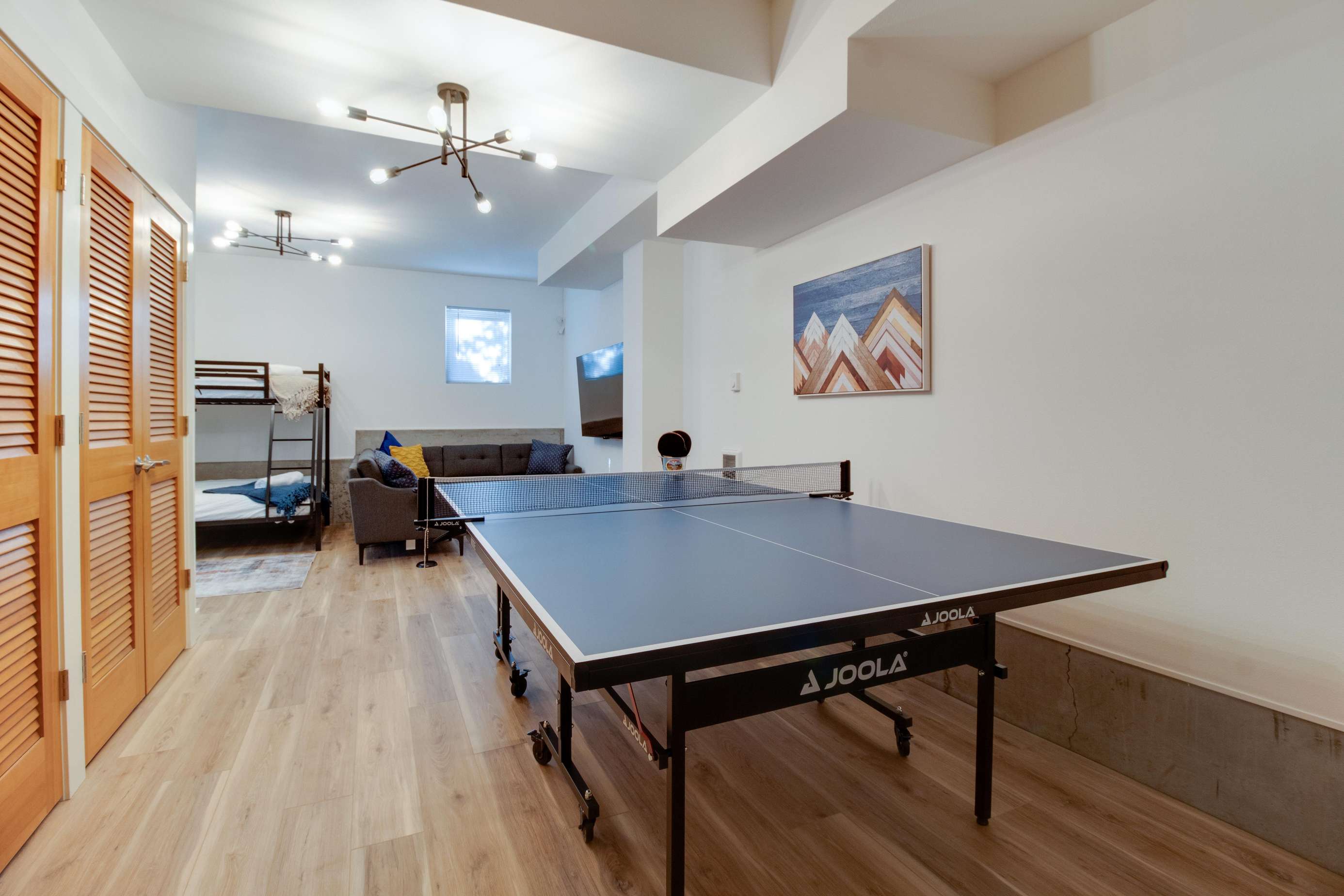 The kid's bunk bed is located in the 1st floor family room. The 1st floor is entirely above ground and has 2 large windows for natural light. This is also a great play space! The ping pong table is on the way and we'll have pics of it as soon as it arrives. The kid's bunk bed is a twin over full and is best suited for kiddos. Adults, these are kid's mattresses, so you've been warned! There is also a 65" smart HDTV in the family room, perfect for movie night. There is a desk in this space right next to a window, so a great place to catch up on work or quietly plan your day, as long as it's not ping pong or movie night! You'll find some games, books and beach towels down here as well.