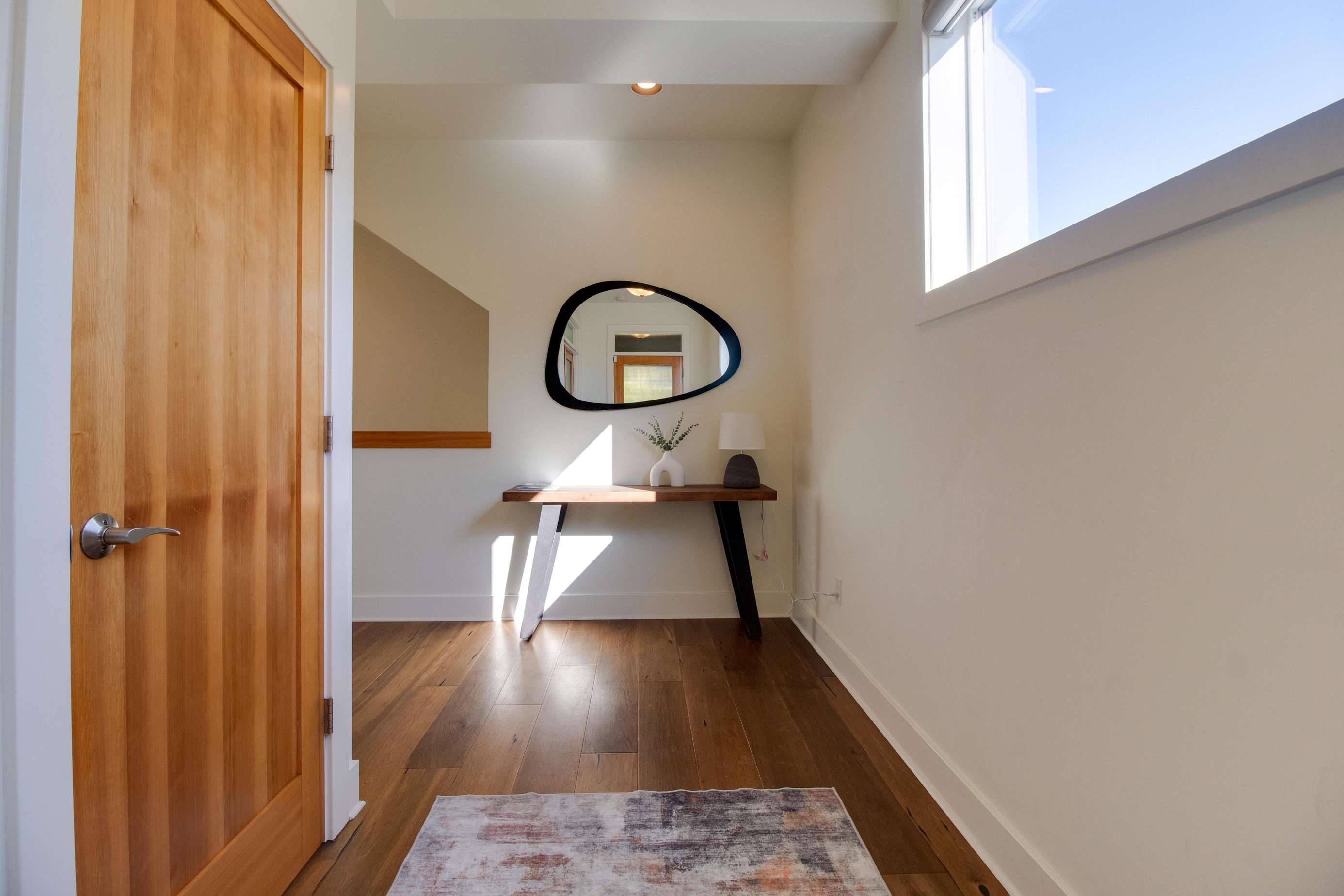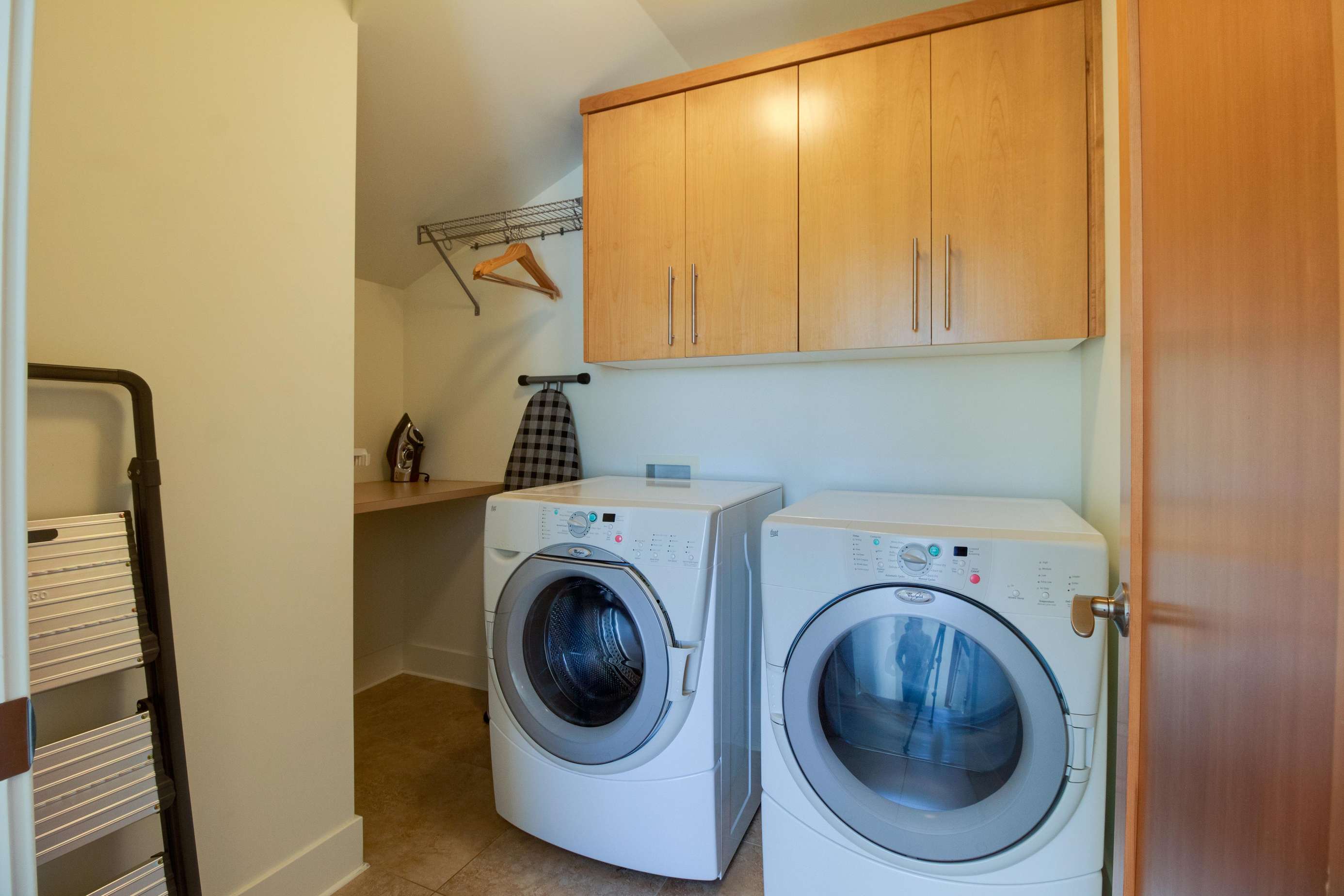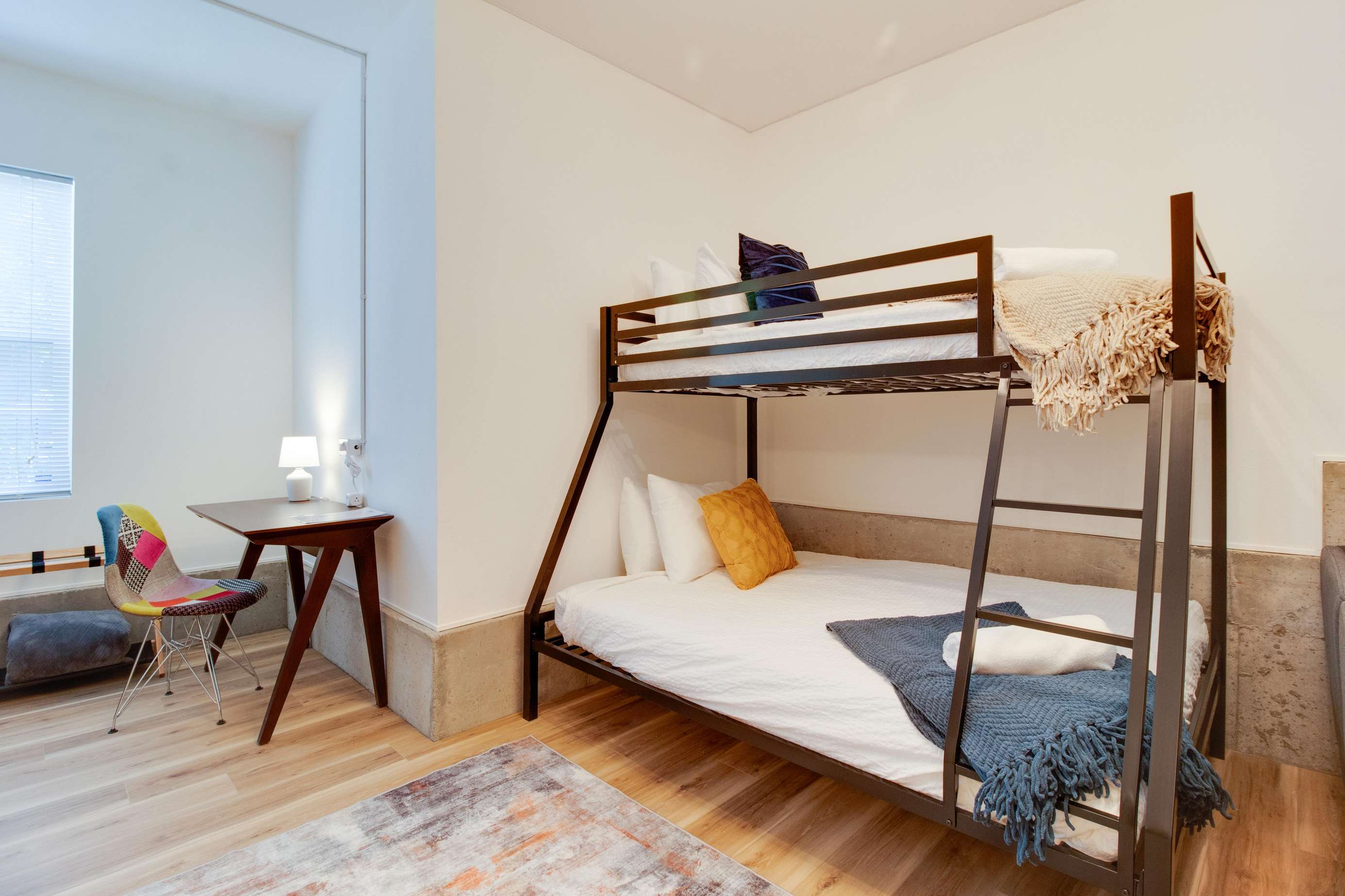 The kid's bunk bed is located in the 1st floor family room. The 1st floor is entirely above ground and has 2 large windows for natural light. This is also a great play space! The ping pong table is on the way and we'll have pics of it as soon as it arrives. The kid's bunk bed is a twin over full and is best suited for kiddos. Adults, these are kid's mattresses, so you've been warned! There is also a 65" smart HDTV in the family room, perfect for movie night. There is a desk in this space right next to a window, so a great place to catch up on work or quietly plan your day, as long as it's not ping pong or movie night! You'll find some games, books and beach towels down here as well.