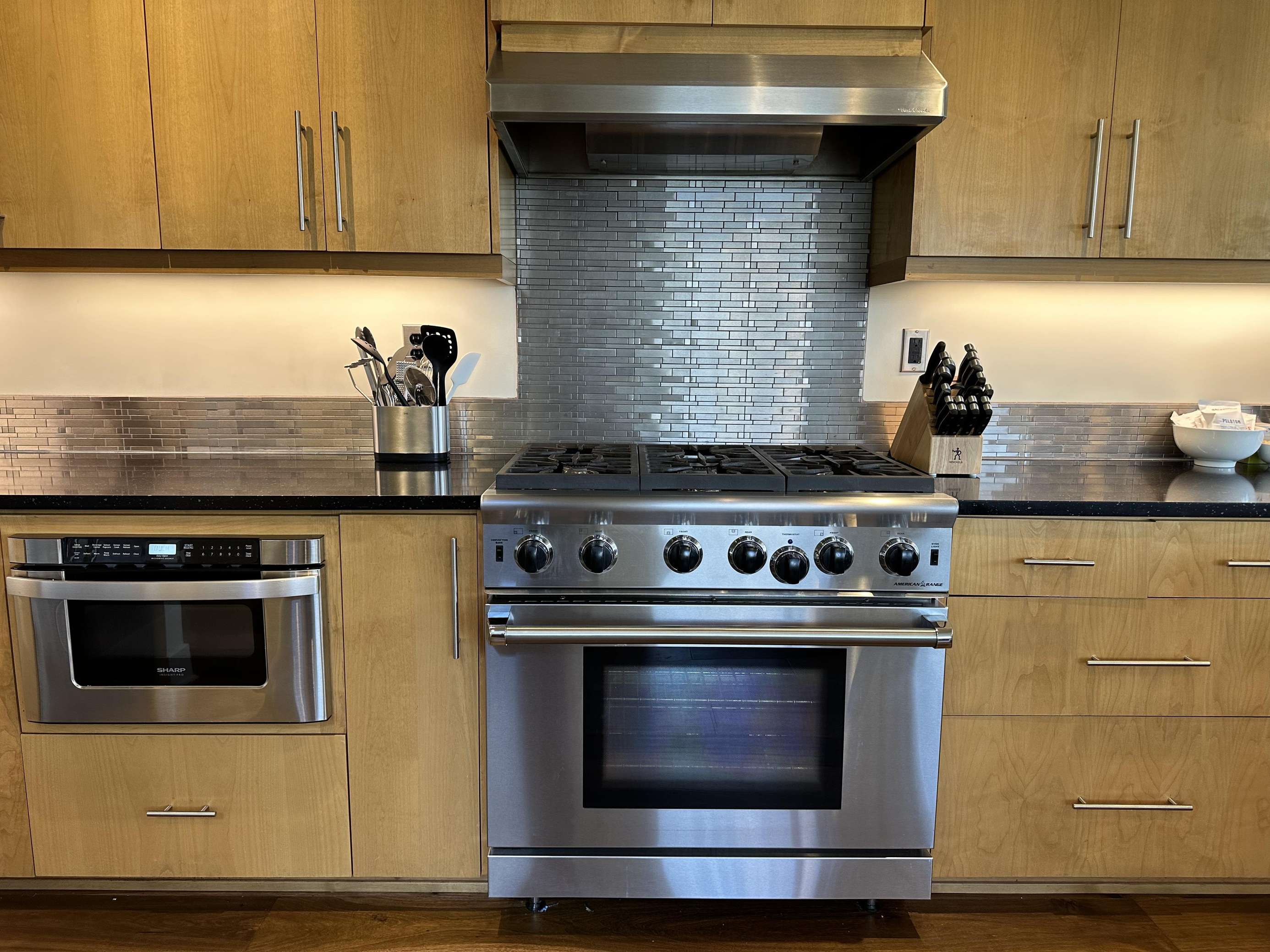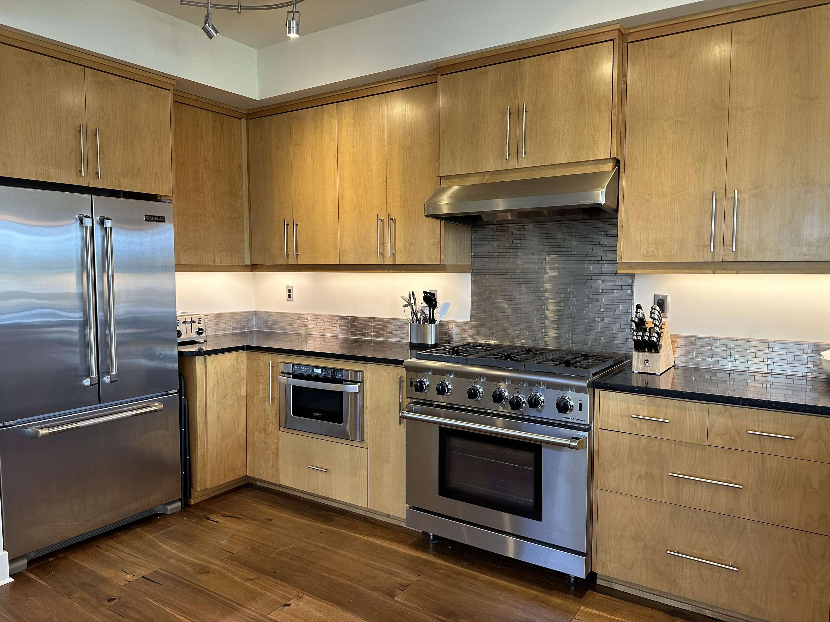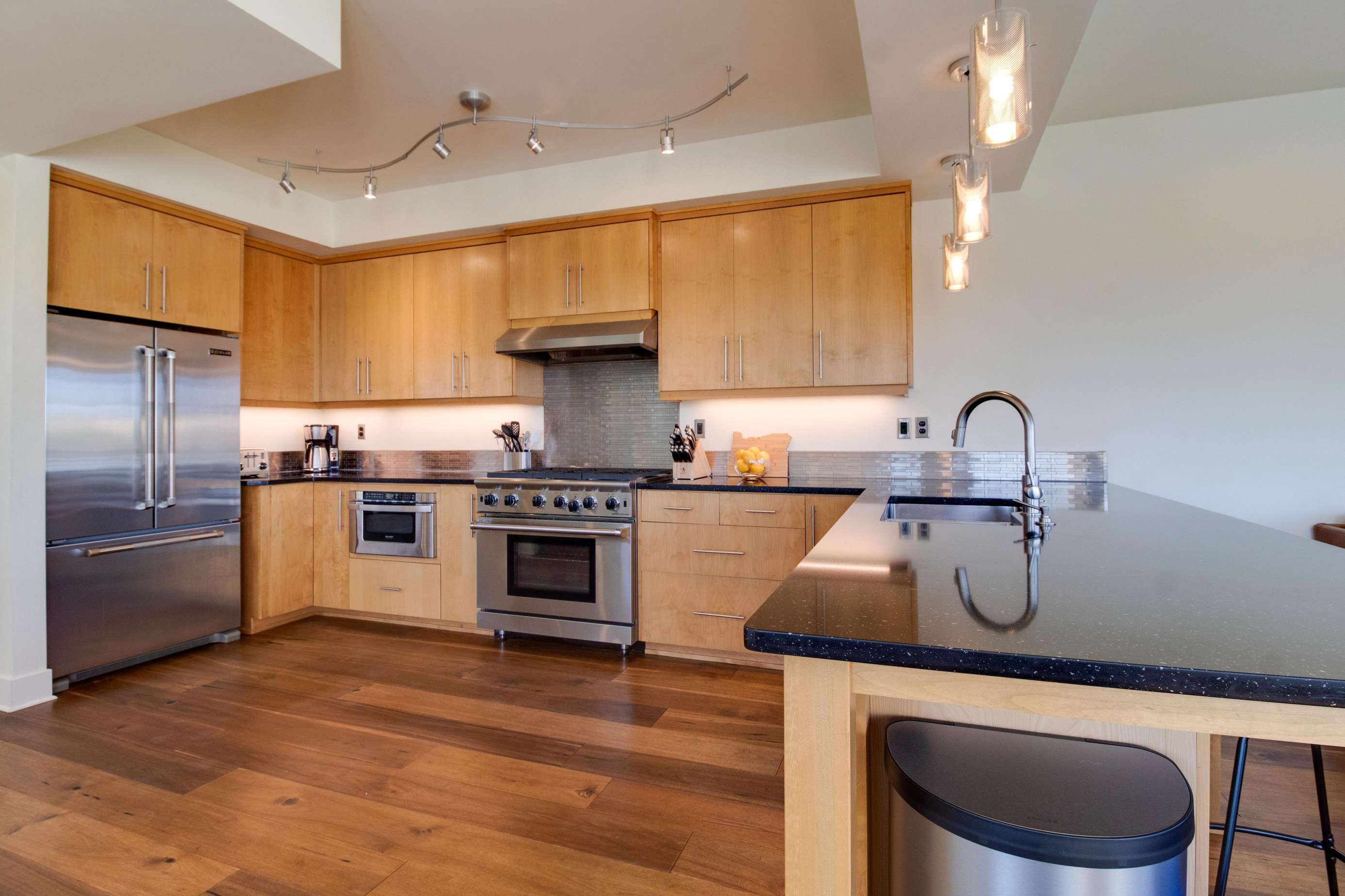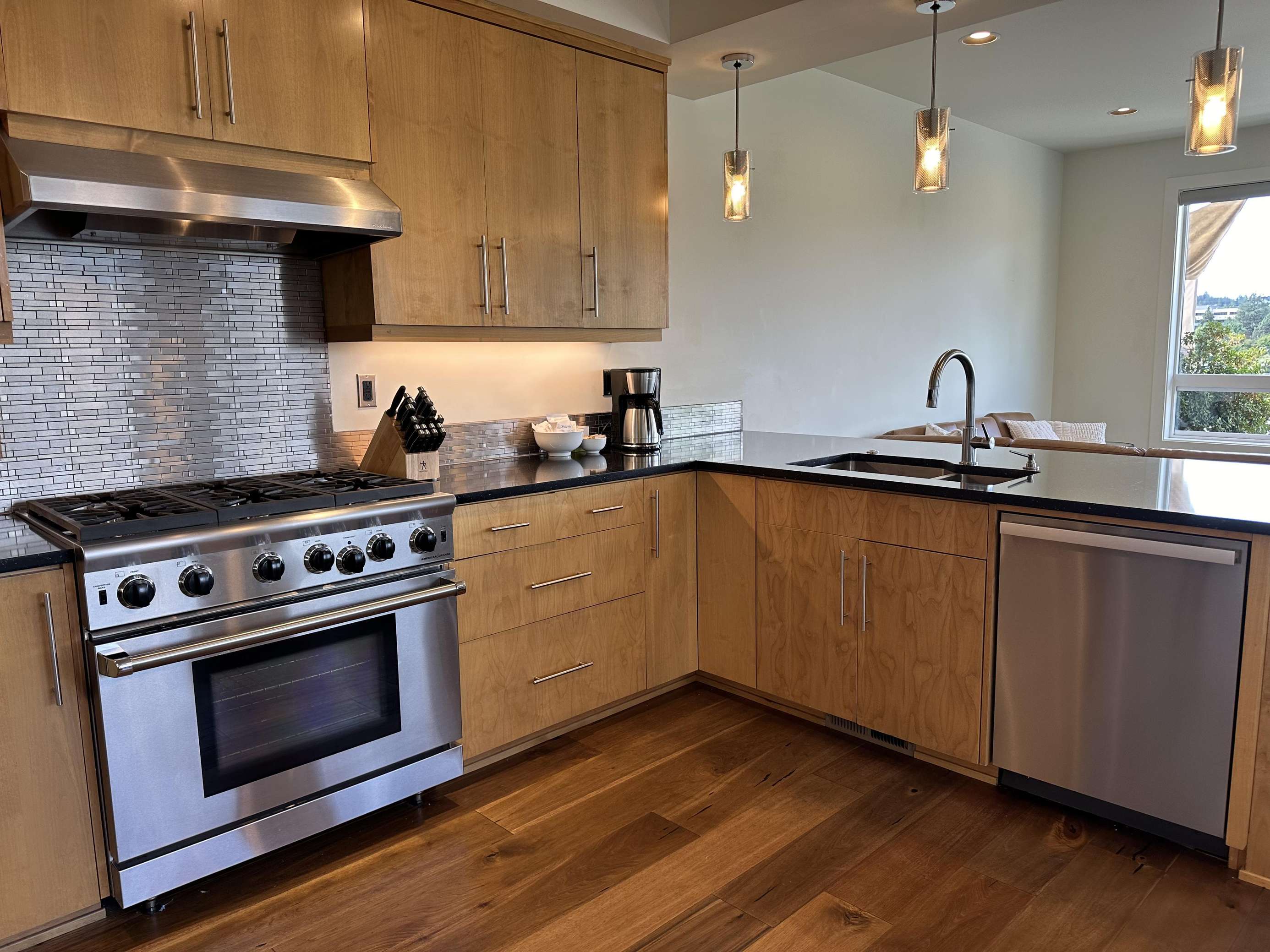 This lovely kitchen is perfect perch for watching the river float by. Whether you're at the kitchen sink, sitting at the bar or prepping dinner on the island, the river is just a gaze away. The deluxe 6 burner gas stove, went external vent hood, is a treat for the chef and you'll find all the utensils, pots, pan you'll need for an amazing meal. Drawer microwave and dishwasher make meals easy. Missing something? Let us know and we may be able to pick it up for you.