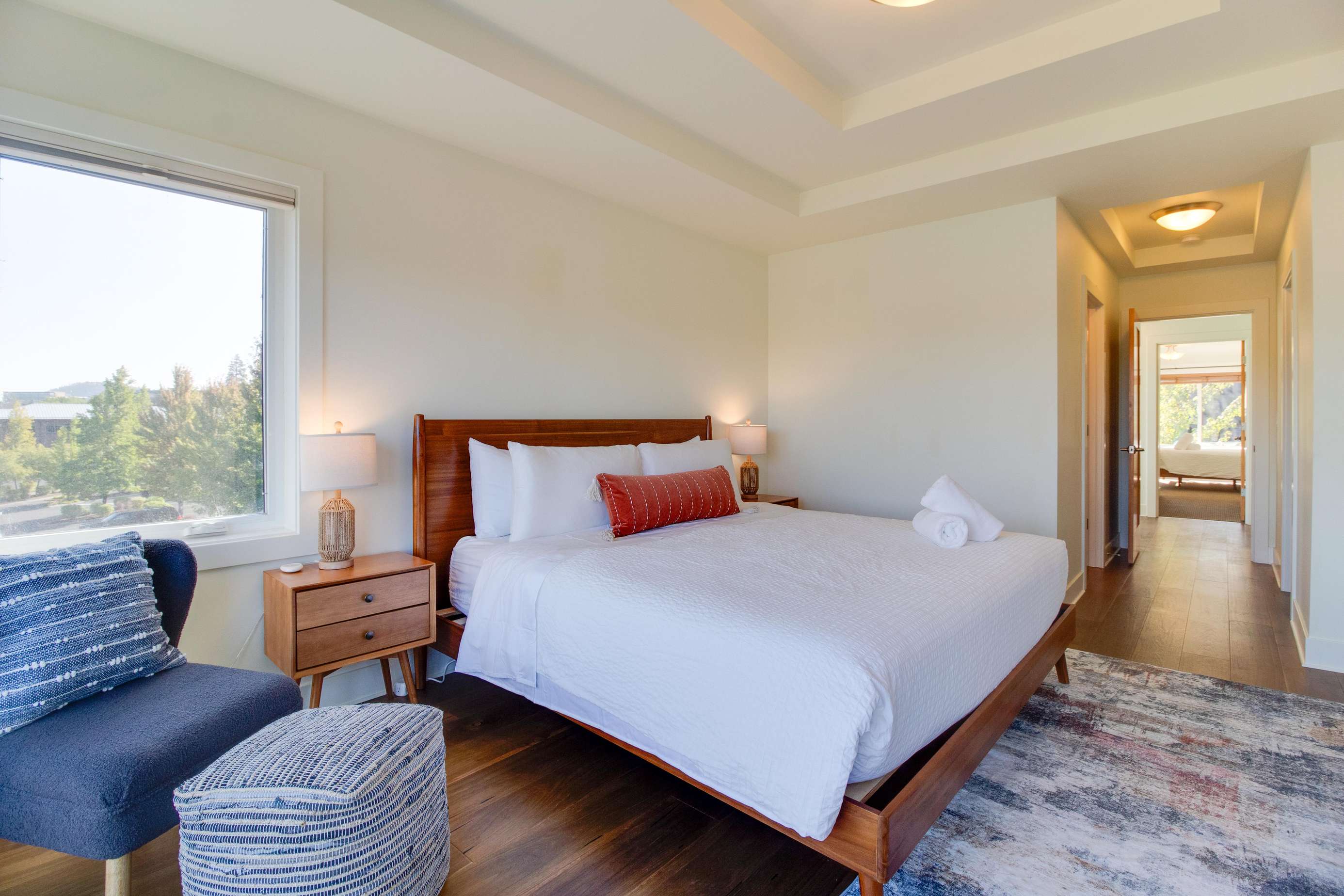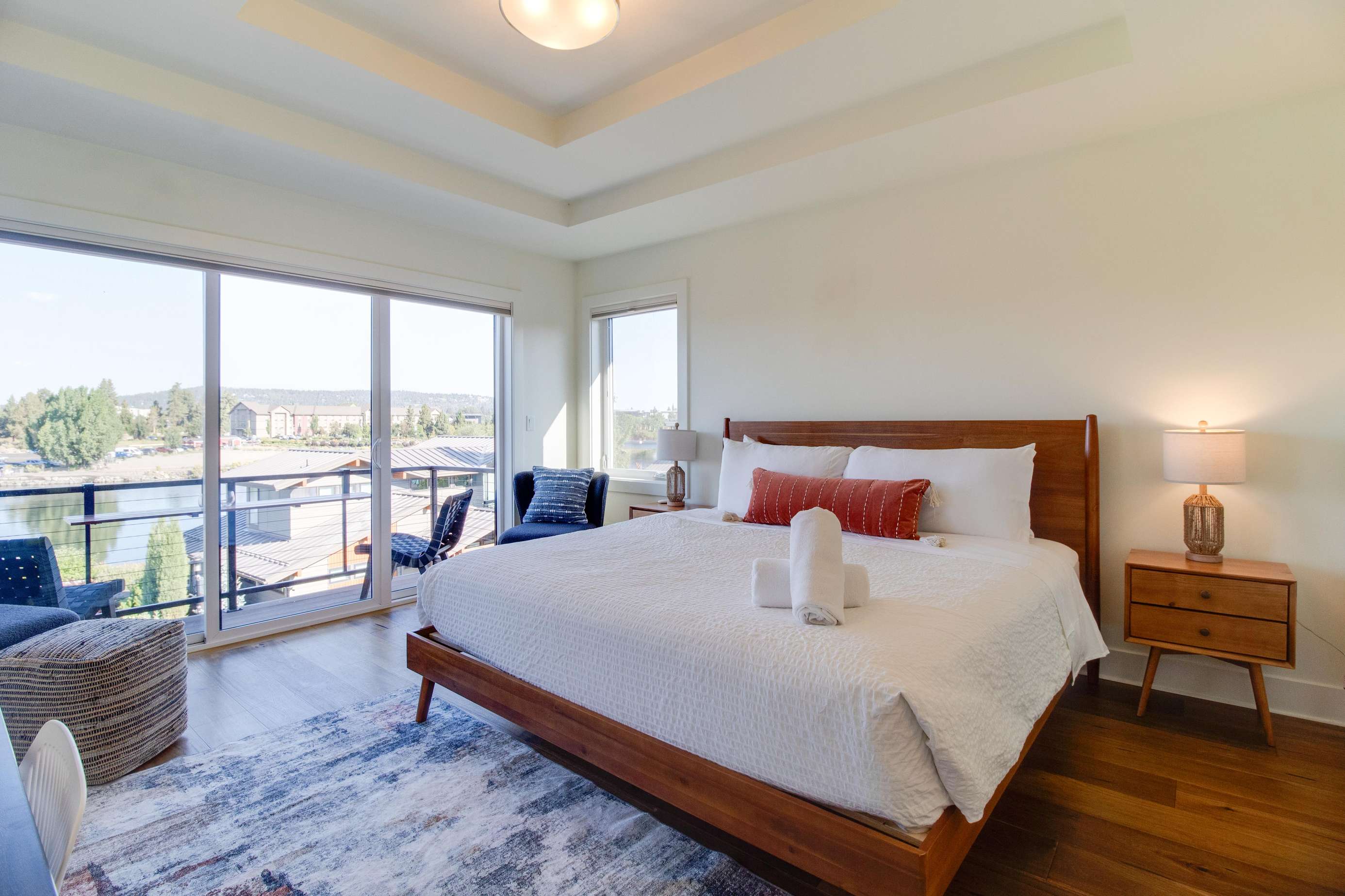 The 1st king bedroom is the river view king bedroom on the 3rd floor. It is light and bright and has one of the best views in the home. The large 3 panel, sliding door encompasses the river and mountain view all day long. You'll love having your own 2 person balcony to soak in the outdoors. It's so lovely to wake up to mountain and water views. There are remote controlled light blocking blinds if you need to sleep in the next day. Don't miss this bedroom's ensuite bathroom with large soaking tub and spacious glass walk in shower. Plenty of storage for your luggage in the large walk-in closet as well.