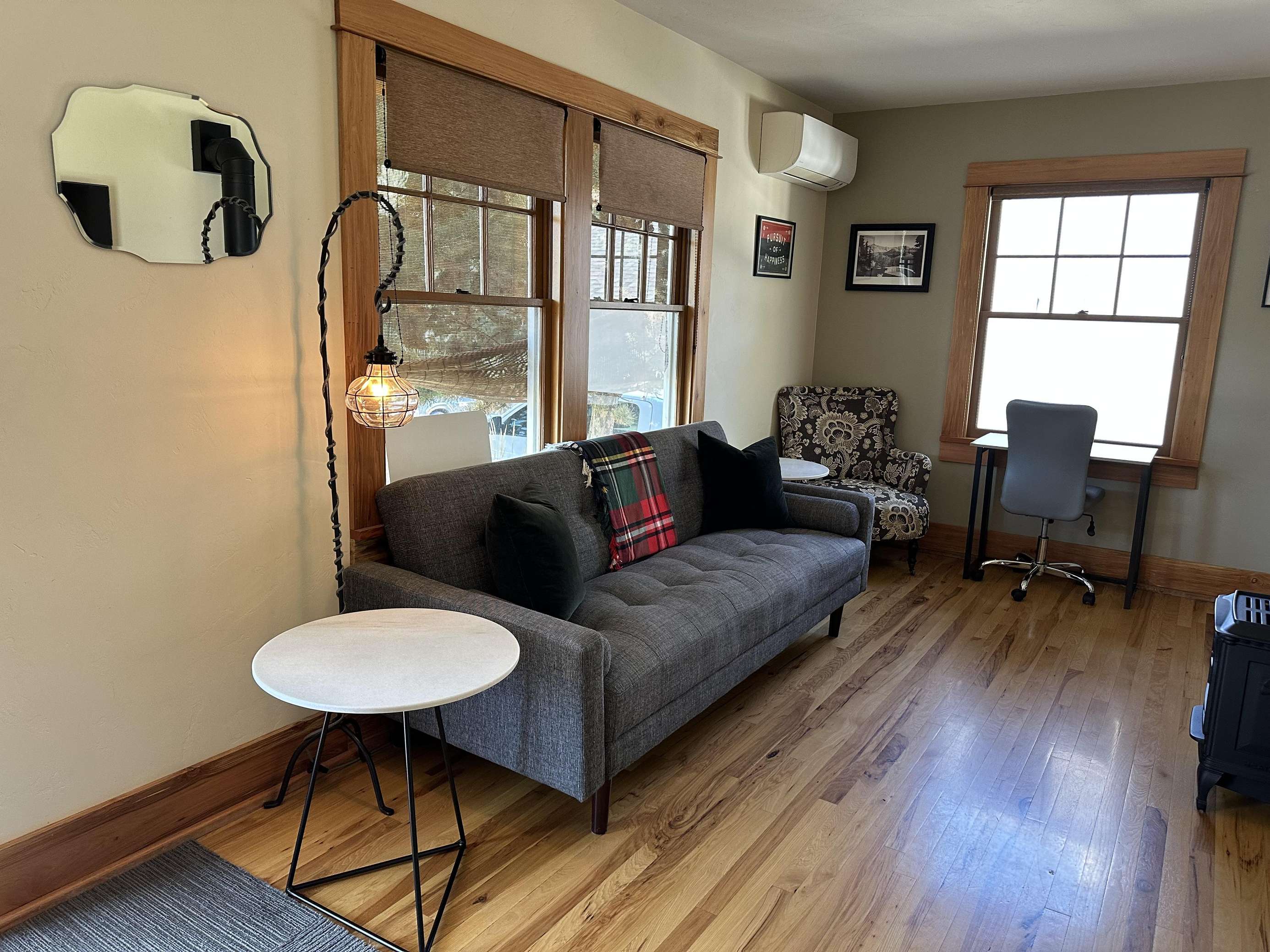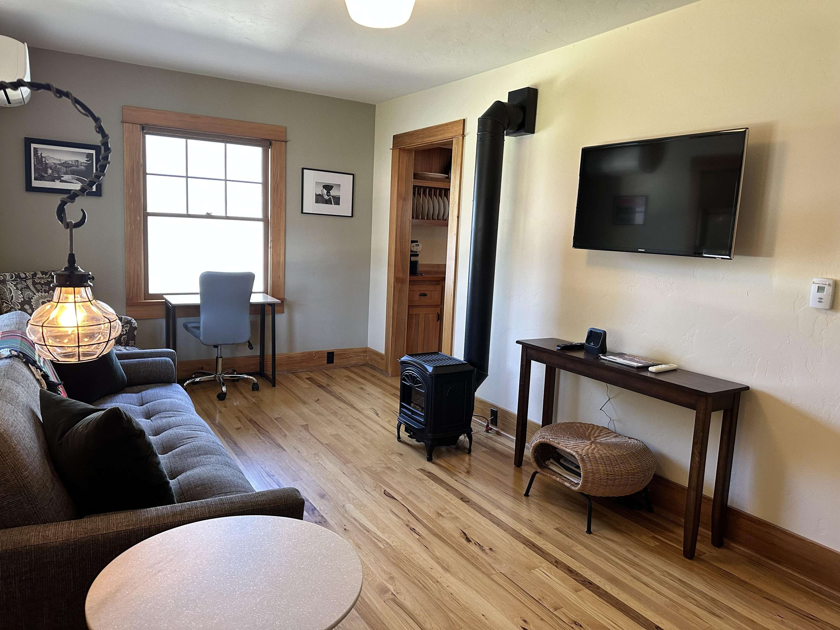 This home is heated and cooled via a wall mounted mini split system in the living room. There are several additional cadet heaters throughout so you can achieve the perfect temperature. You'll find cadets in the bedroom, bathroom, kitchen and dining areas. The gas fireplace is thermostat controlled and keeps the home cozy as well. Fans are also provided if you prefer sleeping with a bit of a breeze. All the restored windows open so you are welcome to let the cool mountain air circulate too.