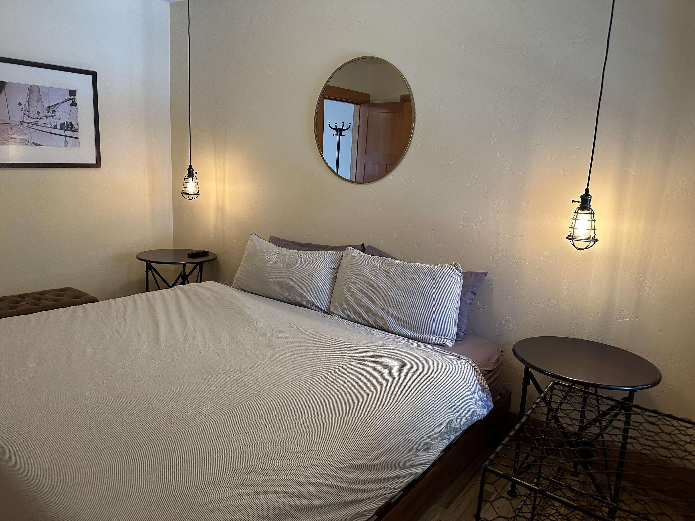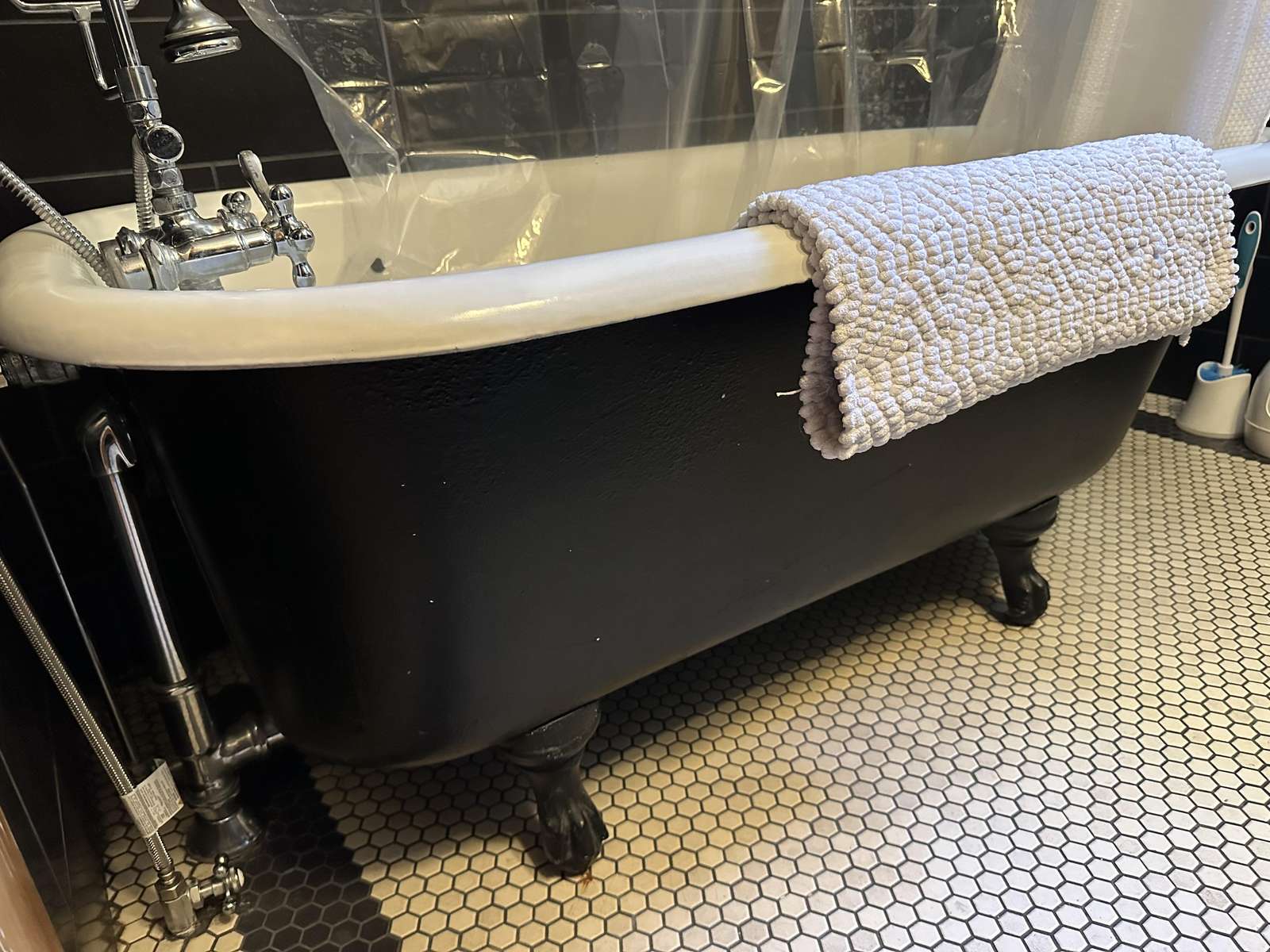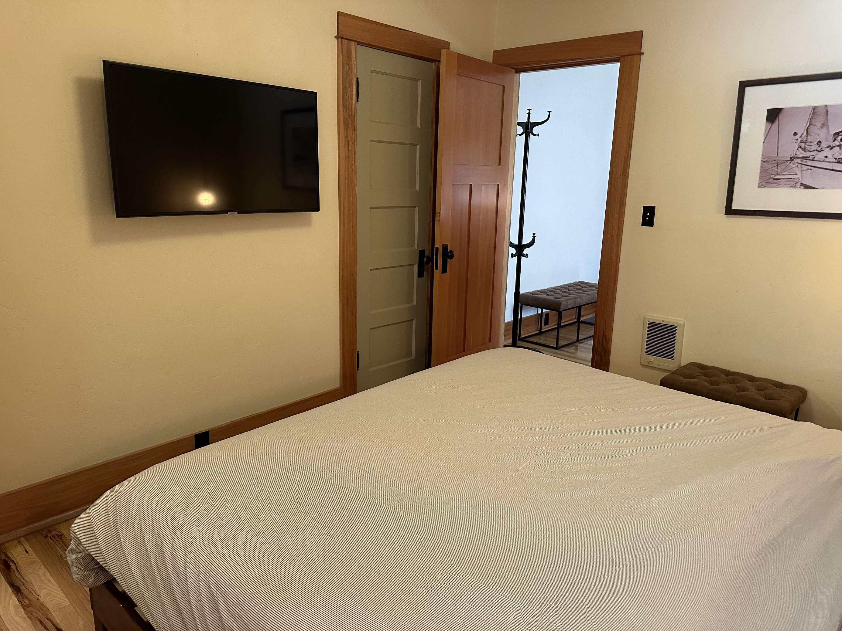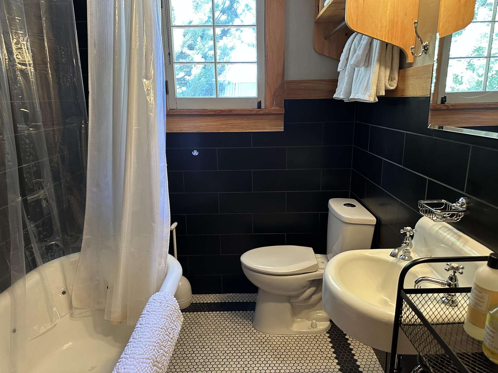 You'll sleep soundly in the king bedroom with ensuite bathroom. The bed features a king Casper mattress and high thread count linens. There is a wall mounted TV in the bedroom as well as a spacious closet. We also provide a white noise machine and portable fans so you can customize your sleeping experience. The ensuite bathroom is fully restored. The heritage clawfoot tub is freshly refinished and surrounded by lovely period tile work.