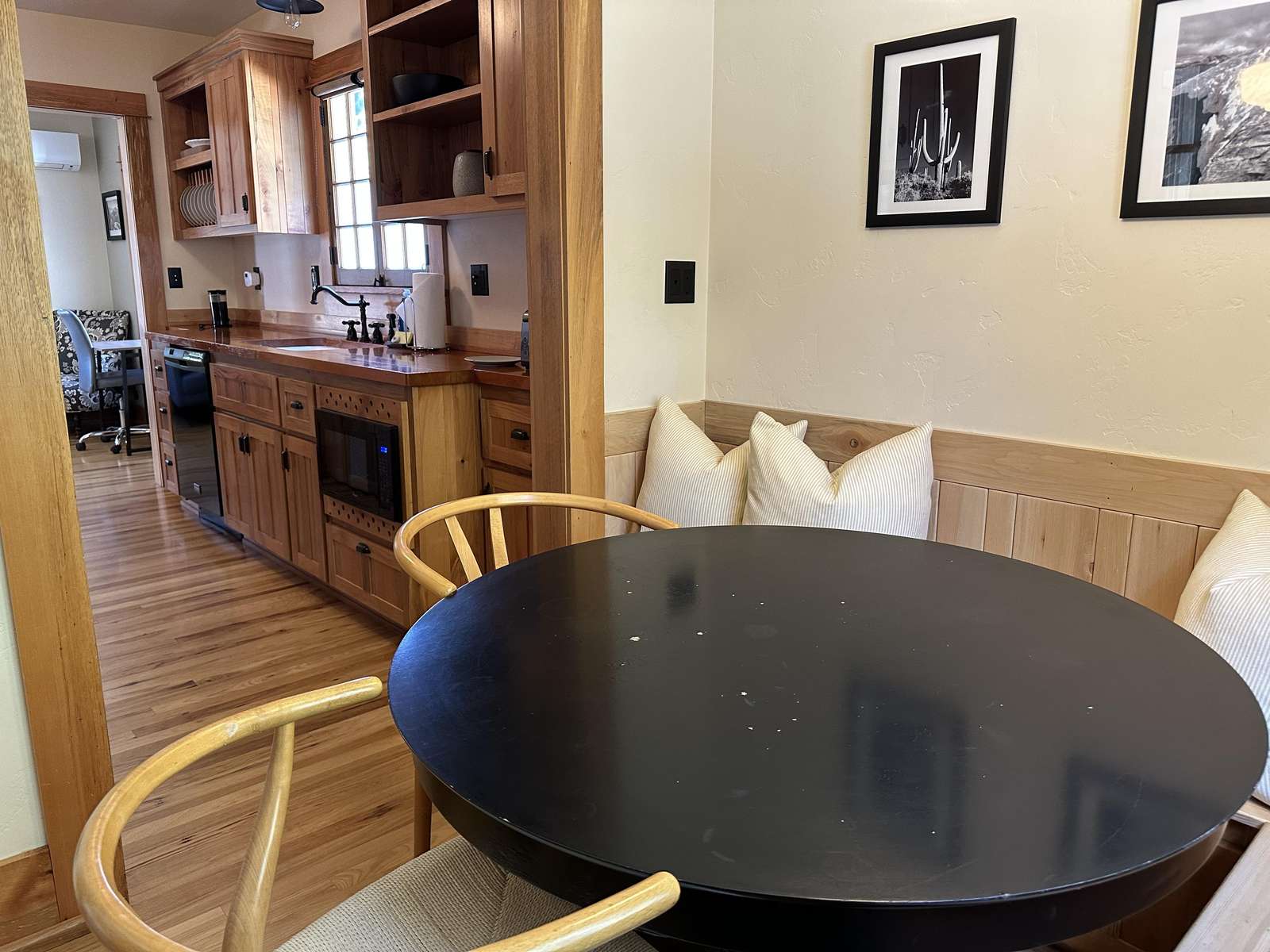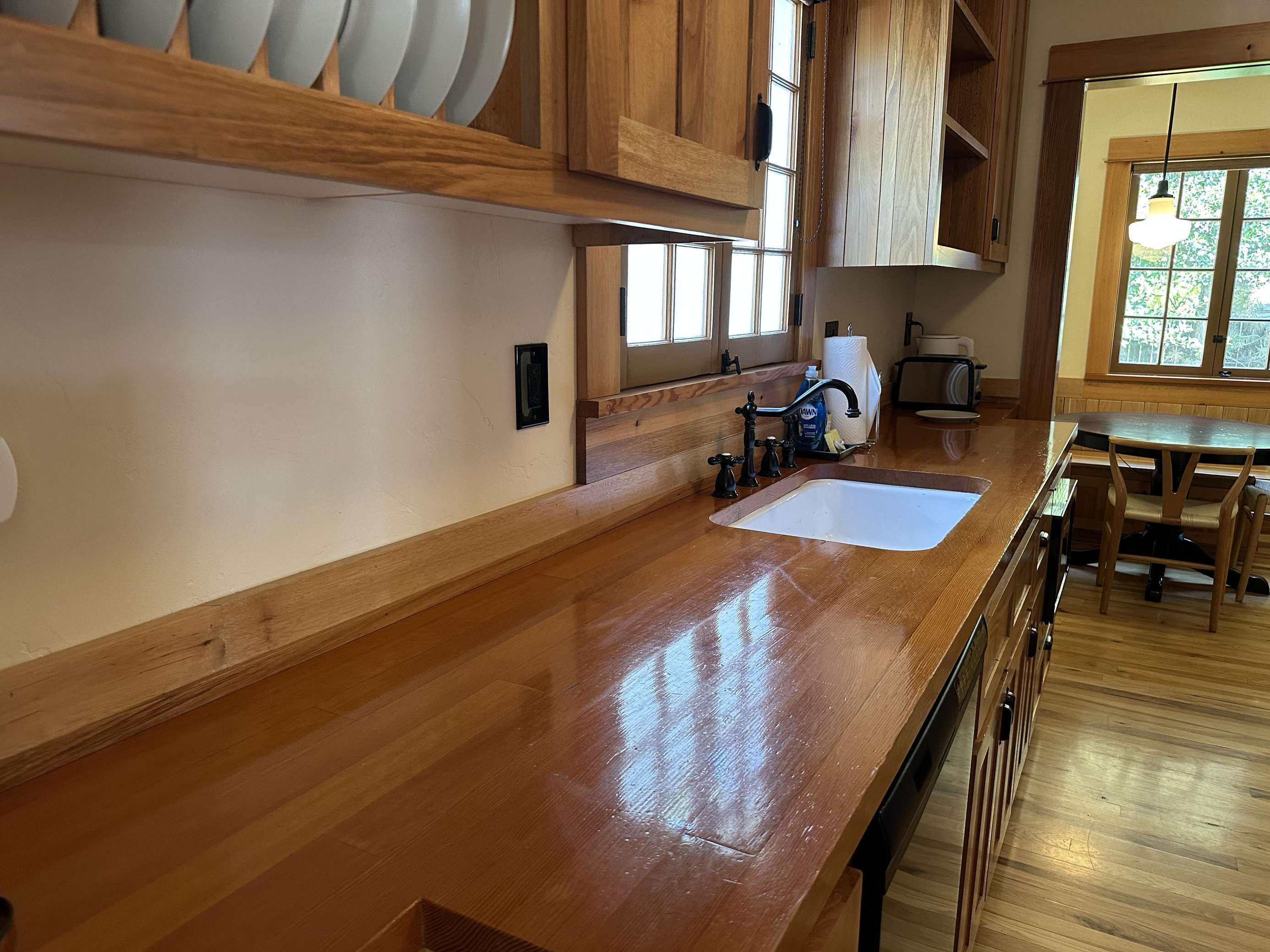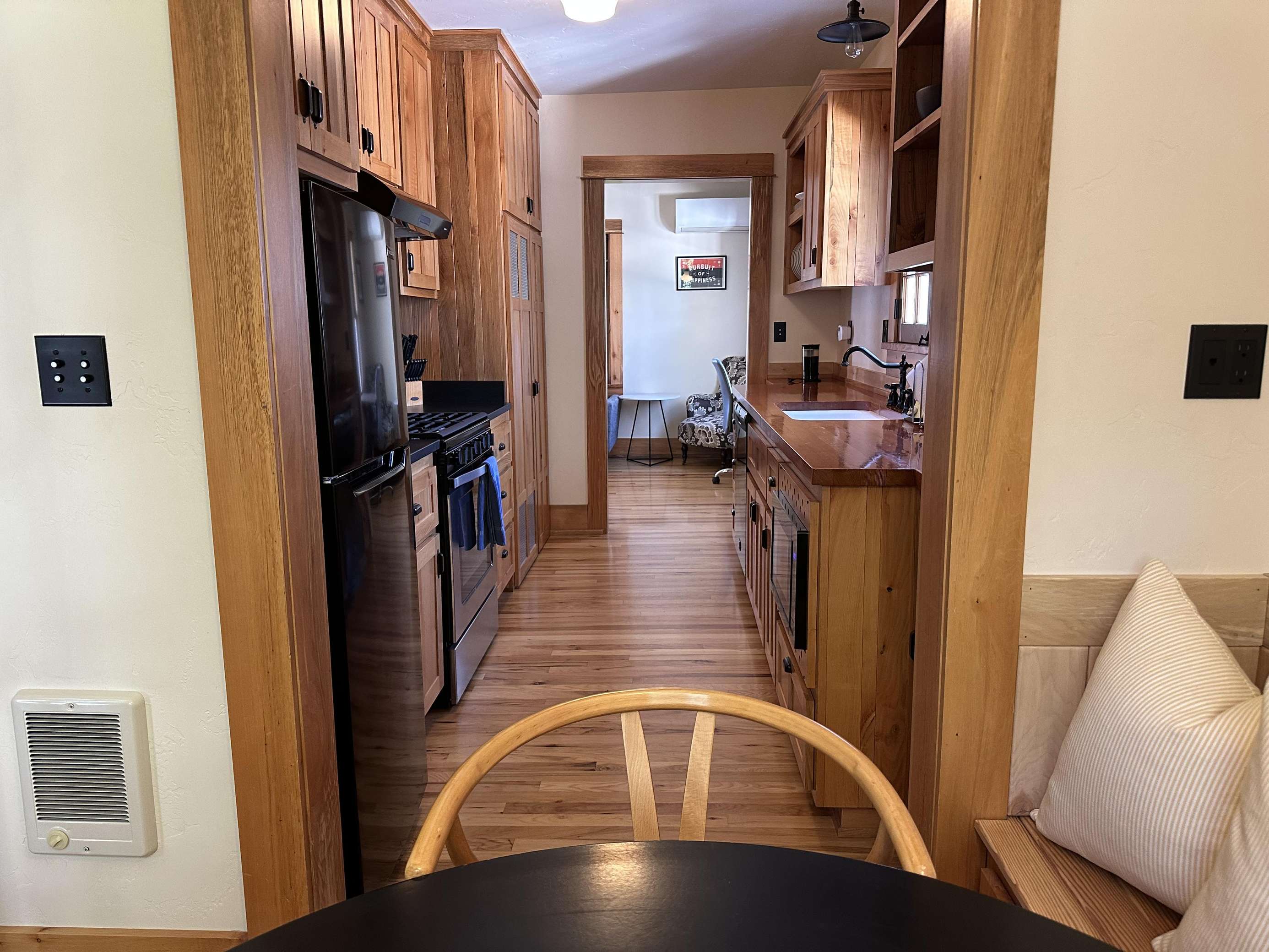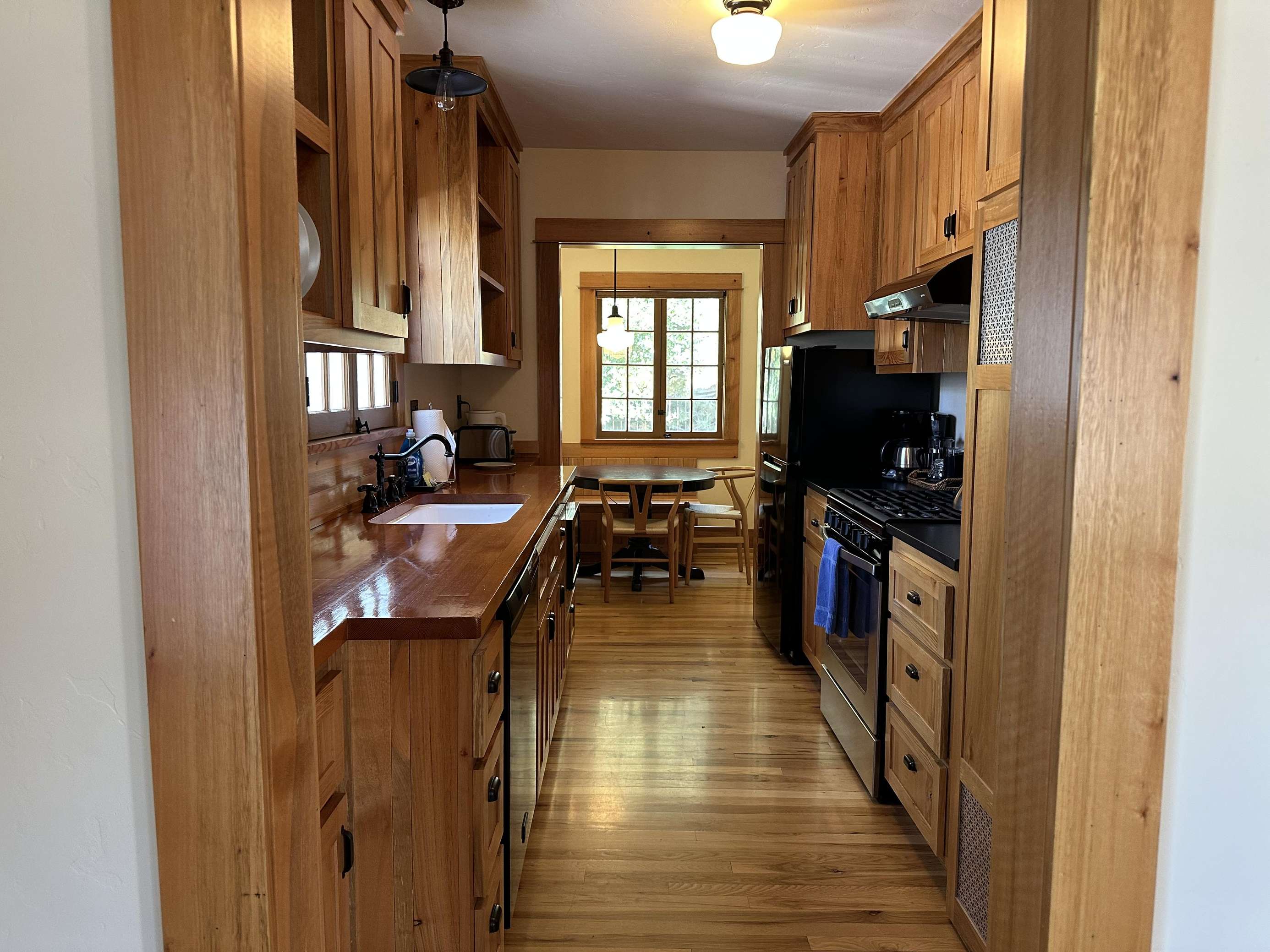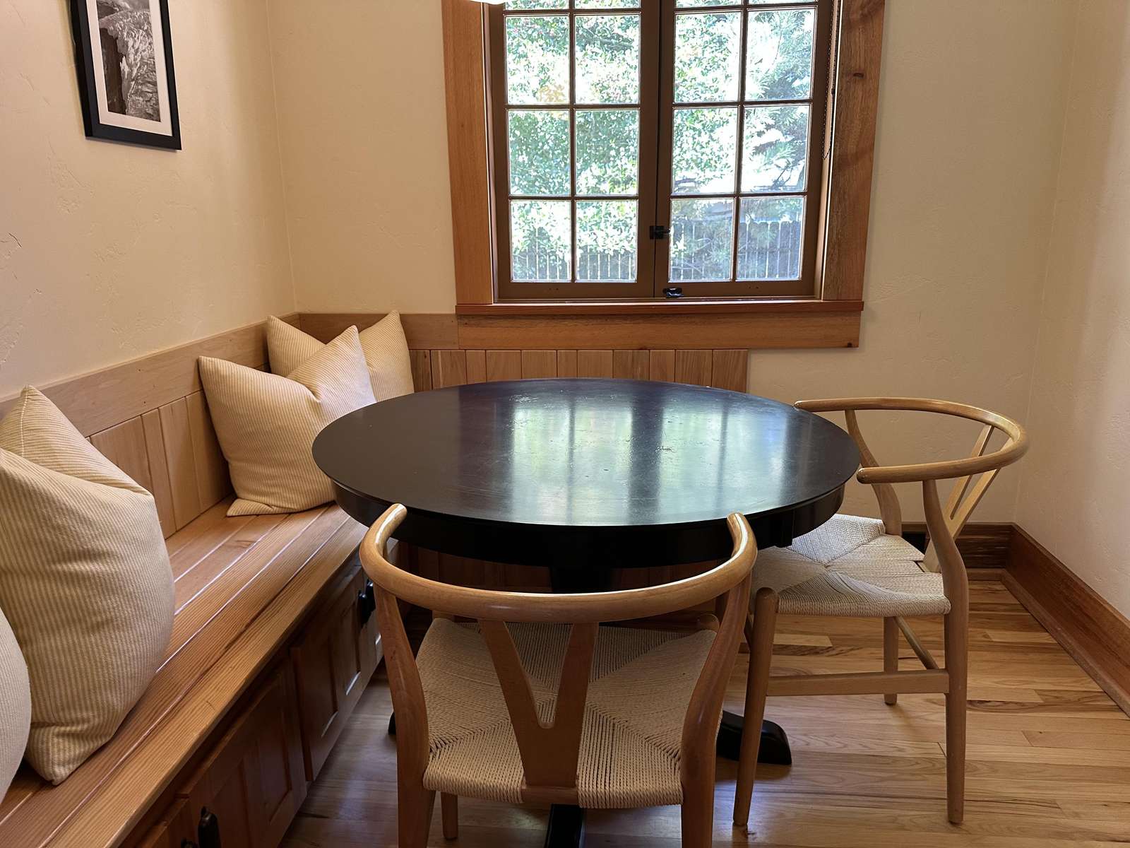 The beautifully reclaimed wood in the kitchen was sourced from a single Oak chinkapin fir tree. You'll find custom cabinets, marble countertops and loads of counter and cupboard space during your stay. The kitchen is magnificent for such a sweet vintage home. The dining area features easy seating for up to 4 and is just adjacent to the backyard. You are welcome to use the propane BBQ in the back yard for preparing your meals as well.