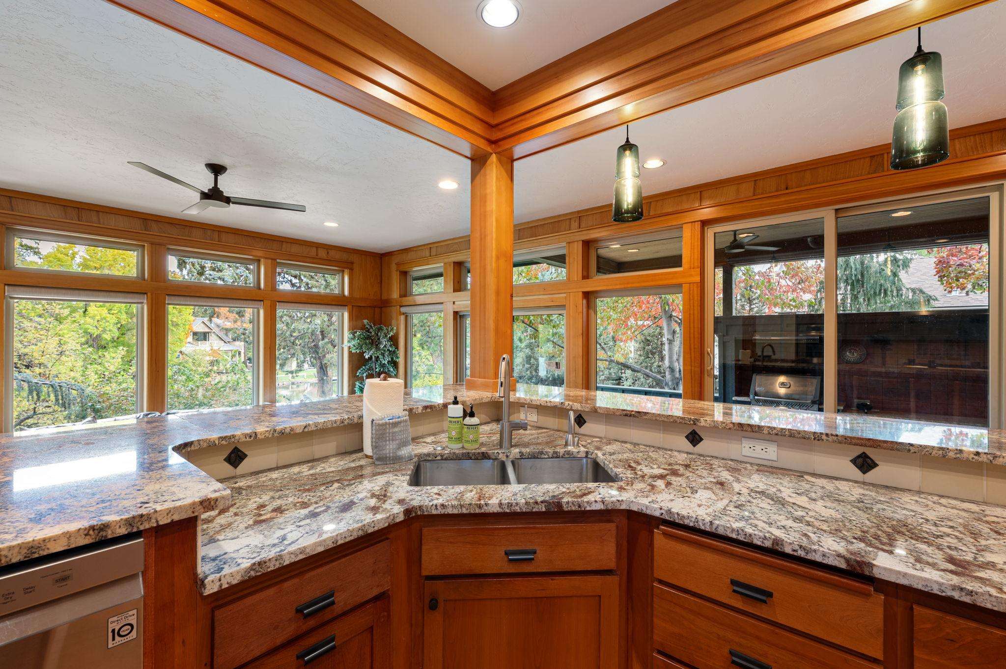This lovely kitchen is perfect perch for watching the river float by. Whether you're at the kitchen sink, sitting at the bar or prepping dinner on the island, the river is just a gaze away.